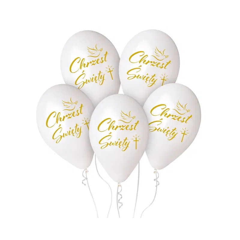 Szukasz czegoś wyjątkowego na Chrzest Święty? 💒 Niech Twoje przyjęcie zyska niepowtarzalny urok dzięki naszym balonom Chrzest Św. krzyż 13"/5szt.! Te białe balony z subtelnym złotym nadrukiem krzyża i napisem "Chrzest Święty" to elegancki dodatek, który nada Twojej uroczystości wyjątkowego charakteru. 🌟