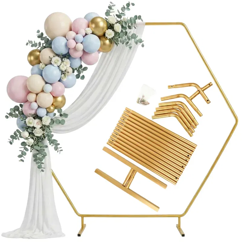 Nie tylko dekoracja, ale i inwestycja w cudowne wspomnienia. Nasz stojak metalowy złoty HEKSAGON przykuwa wzrok i jest idealnym wyborem dla osób, które cenią sobie elegancję i funkcjonalność. Jego wymiary 2x2 metry pozwalają na różnorodne zastosowania, a waga zaledwie 2,5 kg ułatwia transport i ustawienie.